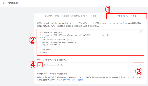(9)①の「手動でインストールする」タブをクリックし、②に表示されたコードをコピーして、測定するすべてのウェブページの <head> の先頭に貼り付けます(注1)。