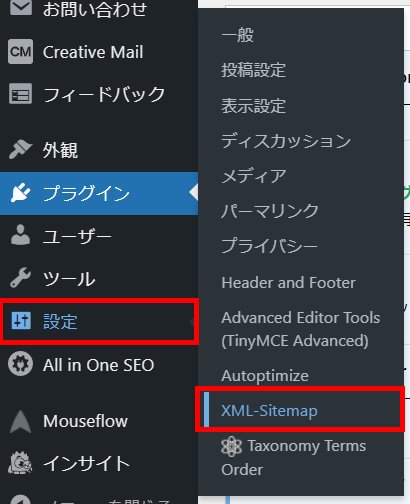 ①WordPressのダッシュボードから「設定」をクリックし、「XML-Sitemap」をクリックします。