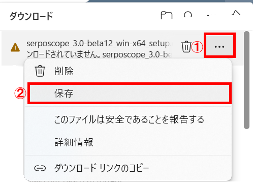 (5)「serposcope_3.0-beta12_win-x64_setup.exe」が「一般的にダウンロードされていません」というエラーになっている場合の処理を説明します。
